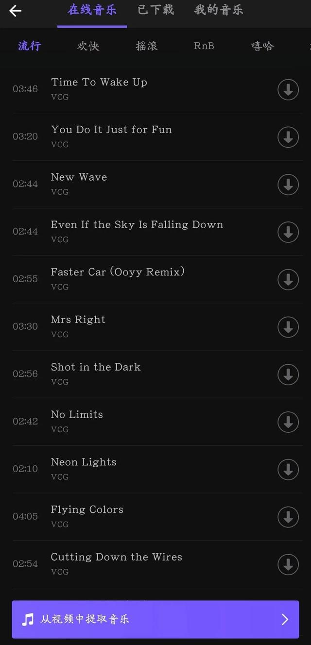 该软件支持添加音乐和音效。音乐可以添加在线音乐、本地喜欢的音乐或者从视频中提取,非常方便。