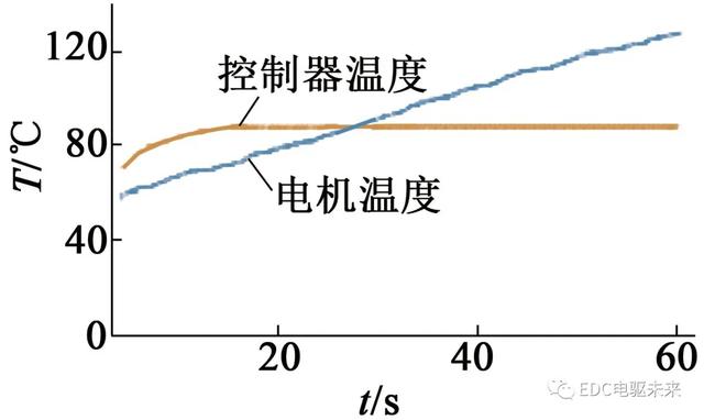 为了确定控制器IGBT在峰值工况下的真实温升,在样机上进行了温升实验。控制器进水口水温为65℃,流量为8 L/min,系统峰值工况下的温升曲线如图11所示。从图11可以看出,峰值工况下,IGBT检测到的最高温度稳定在89℃左右,预计芯片温度在115℃以下,满足使用要求。60 s内电机最高温度约为130℃,满足磁钢的使用要求。