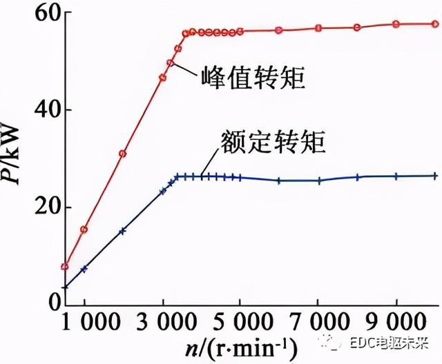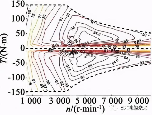 系统的输出特性如图9所示。三合一电驱动系统在电动和发电两种工况下都能稳定输出55kW的峰值功率和150n·m的峰值扭矩。三合一电驱动效率测试结果如图10所示,在电动工况下,系统最高效率为95.5%,控制器最高效率为98%,电机最高效率为97.5%。在发电条件下,系统最高效率为94.5%,控制器最高效率为97.5%,电机最高效率为97.5%。通过软件计算,系统效率大于80%的区域占81.0876%,控制器效率大于80%的区域占93.1055%,电机效率大于80%的区域占91.172 7%。