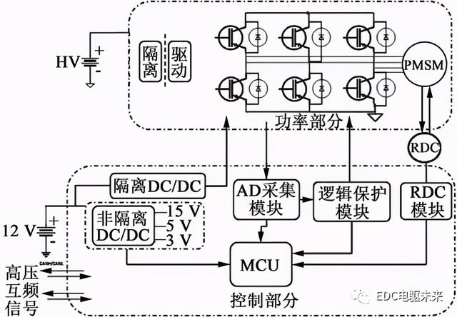 三合一电驱动系统的PCB由控制板和驱动板组成。驱动单元和控制单元通过线束相互通信,以避免高压和低压之间的干扰。PCB电路通常集成有通信电路、温度采样电路、电压采样电路、相电流采样电路、转子位置检测电路、功率转换电路、驱动电路以及各种保护功能电路等。这些电路组合在一起,保证了整个三合一电传动系统的正常运行。