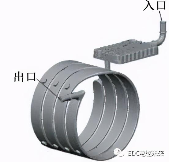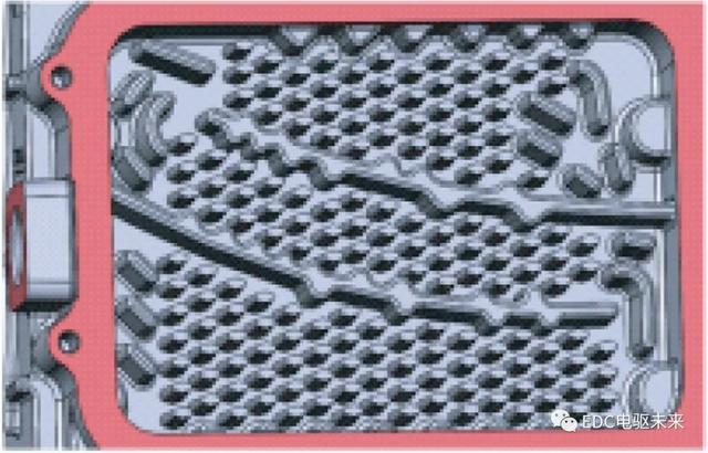 与分体式电驱动系统不同,三合一电驱动系统具有更高的集成度和热集中度,系统的冷却设计是三合一产品开发过程中的关键环节。本文三合一电传动系统的冷却水通道结构如图5(a)所示。电机外壳采用螺旋水道设计,减少流动阻力,增强对绕组的冷却效果。电控冷却水道出口与电机冷却水道入口一体化设计;控制器的水道结构如图5(b)所示。水道内设计了云形翅片结构,增加了该部分的散热面积,增强了IGBT的冷却效果。工作时,冷却液首先从车辆冷却系统进入电机控制器,然后对电机控制器进行冷却散热后流入电机,对电机进行冷却,最后冷却液从电机出水口流出,完成系统的冷却散热。