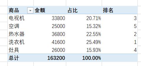 还需要快速计算出每个商品的比例和商品的排名,即得到如下结果。