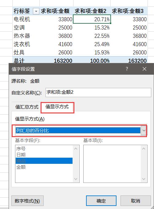然后,在值字段设置中,选择值显示模式和列汇总的百分比。