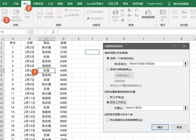 首先,我们选择数据,然后创建一个数据透视表。为了便于查看数据,我们将数据透视表的位置放在现有工作表的位置F3单元格中。