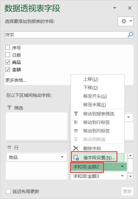 为了计算比例,我们单击“合计项目:金额2”,然后单击“值字段设置”。