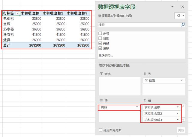 然后,将“商品”字段拖动到行标签中,并将“金额”字段连续三次拖动到值中。数据透视表中显示的第一个结果是对商品进行三次求和。
