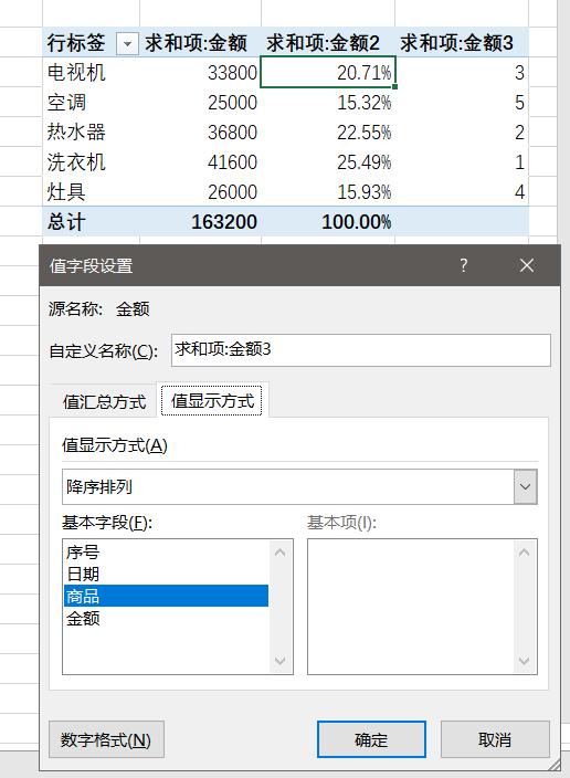 为了计算排名情况,对sum项进行同样的操作:金额3,在值字段设置中,将值的显示方式改为降序。