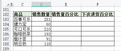 如下图所示,对于价格相同的商品,我们需要计算每种商品的销售数量百分比,根据销售数量百分比,计算下一次采购数量的最佳比例。