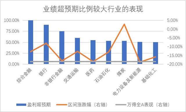对比业绩预告水平与wind分析师预期可以发现,超预期比例超过50%的行业在此轮下跌行情中表现相对较好,普遍低于万得全A的调整水平,煤炭板块甚至实现了小幅上涨。
