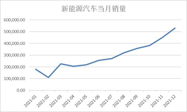 与常识不同的是,虽然上游原材料价格高企加大了中游制造业的成本压力,但汽车、电力创新、机械等行业的表现依然亮眼。这些行业下游旺盛的需求带来的超高景气,抵消了部分成本上涨的影响,尤其是新能源汽车相关的产业链。Wind数据显示,2021年新能源汽车月销量继续保持高增长态势,去年12月月销量突破50万辆,创历史新高。