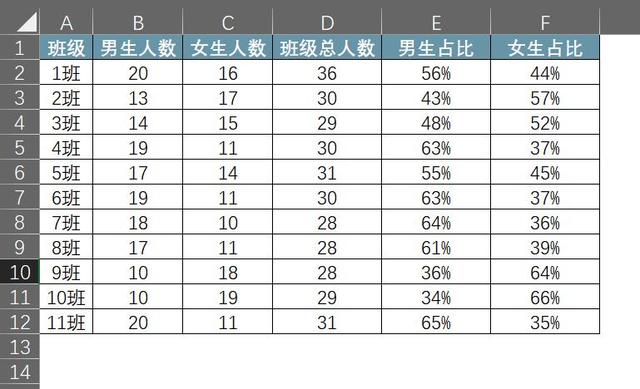 第九步。这时候你就可以很容易的得到各个班级男女生比例的数据,如下图所示: