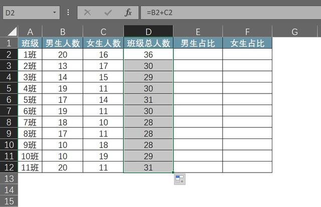 第二步:如果需要计算男女生比例,首先需要计算每个班级的学生总数,总人数=男生人数+女生人数,即D2=B2+C2,具体操作方法如下: