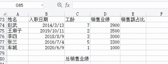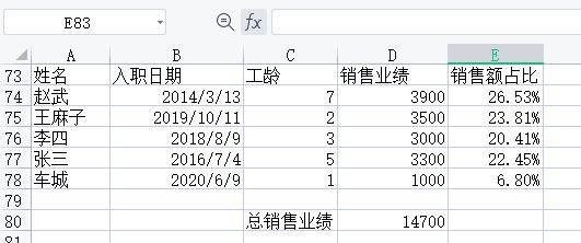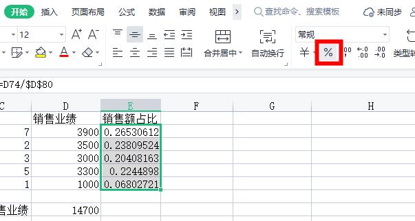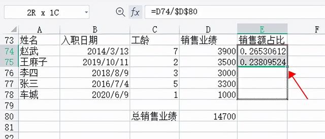 如果不想计算销售业绩,也可以直接修改公式为[=D74/sum($D:$D)]。