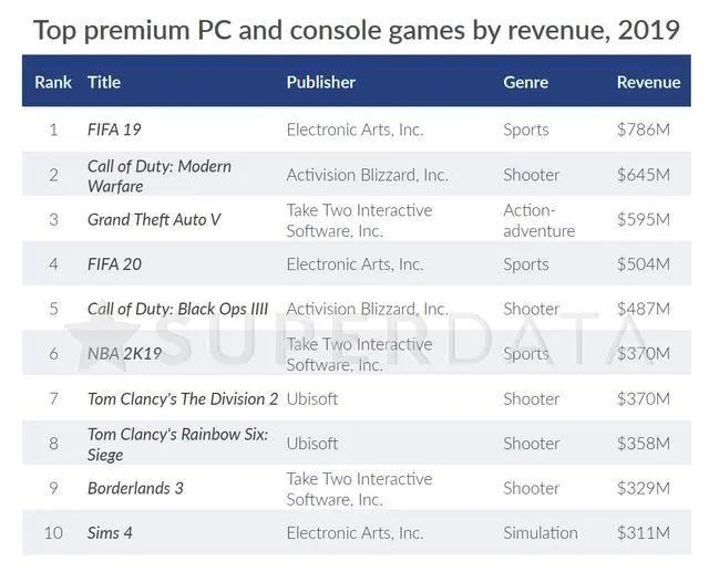 2019年PC和主机游戏收入榜上,大部分都是EA、育碧、动视的贺岁游戏。