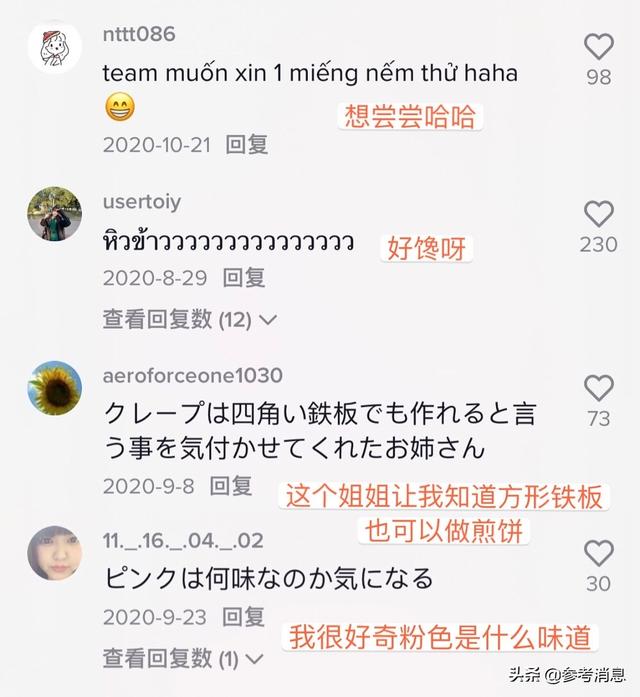 隔着屏幕,能闻到煎饼的果香。薄而软的煎饼上包裹着嫩滑的鸡蛋。酥脆的薄皮和清爽的配菜正好中和了油腻的酱料。咬一口,外脆里满是焦香味。这不禁引来外国网友好奇,“这是什么?”也有抖音用户直接“看饿了”“面前的菜突然不香了”。