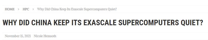 在最新超算榜单发布之际,国外科技媒体The Next Platform发文称,今年3月,中国两台超算取得E级计算性能第一,但不参与排名。文章称,这一现象表明,尽管美国投入了数十亿美元,但不可能在超级计算领域领先中国。