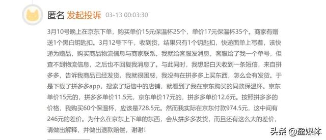 该用户投诉称,JD.COM商家冒充拼多多平台来赚取差价。“JD.COM单价15元,拼多多单价11.5元;在JD.COM单价17元,拼多多12.6元。按照拼多多里的价格,我买60个保温杯,应该是728.5元。但我在JD.COM实际支付了974.5元,相差246元。”