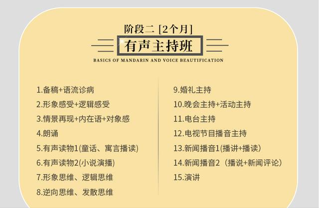 根据坦洲课堂“助教”提供的课程设置,课程分为三个阶段,即基础班、主持班和高级班。每个阶段2个月,完成整个课程只需要6个月。