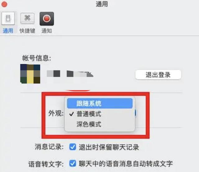 除了以上,目前PC端的微信还支持黑暗模式,我们点击左下角的设置就可以看到。不过有一点,黑暗模式需要10.14及以上的系统。