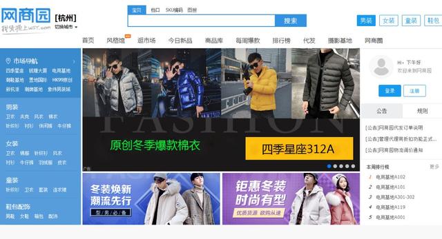 杭州的服装货源批发网,市场包括四季星座、之江服装电商大厦、四季青、意法服装城、新航派等。它有自己的配送应用程序,有15000个摊位。