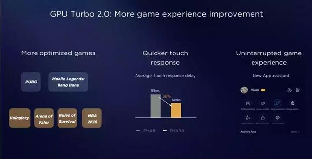 游戏方面,作为GPU Turbo2.0的升级版,深度优化了PUBG、NBA2K18等众多国外热门手游的游戏体验。同时,GPU Turbo2.0进一步优化了点击延迟,为用户带来更快的点击响应,平均触摸响应延迟时间降低36%。