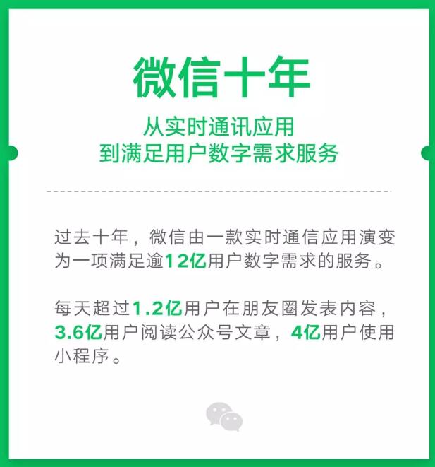 每天有超过1.2亿用户在朋友圈发布内容,3.6亿用户阅读微信官方账号文章,4亿用户使用小程序。每天1.2亿用户在朋友圈发布内容?什么概念?相当于全日本人口在朋友圈发布内容。