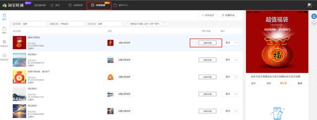 2。打开旺铺智能版,选择装修详情,找到想要装修的宝贝,点击装修页面。