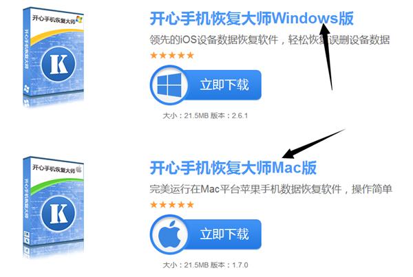 第一步,找回微信聊天记录,首先要在电脑上安装下载开心手机恢复大师,下载方式不限。用这个专业的苹果手机数据恢复软件帮我们找回微信聊天记录。下载时注意区分软件版本:Windows系统版本和Mac系统版本。