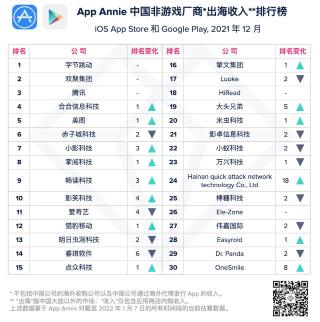 IT之家1月17日报道,今天上午,App Annie发布最新报告,带来了2021年12月中国非游戏厂商及应用出海榜单。字节跳动和其短视频平台抖音分别在制造商和应用程序列表中排名第一。