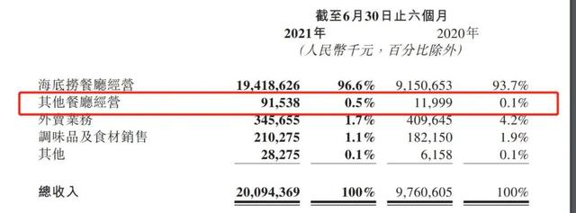 翻到海底捞的财报,“其他餐厅经营”收入占比仅为0.1%。