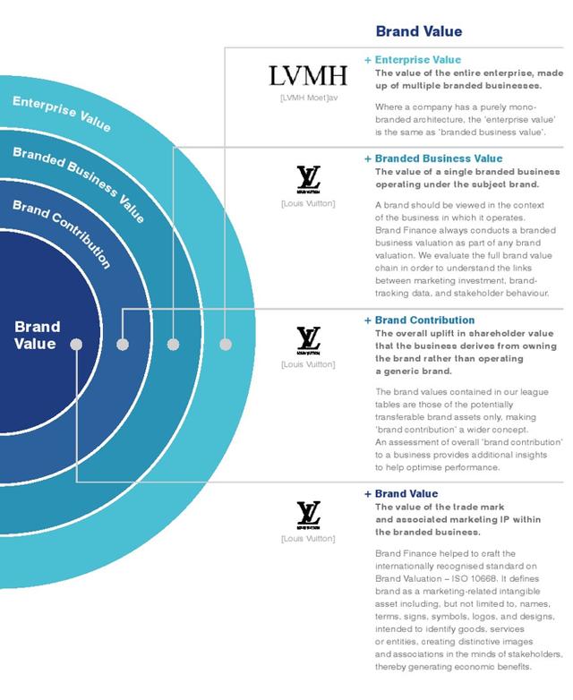 其中,圆圈的中心是品牌价值,另外三层是品牌贡献、品牌商业价值和企业价值: