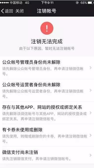 如果六个或四个条件都不能满足,将出现提示“注销无法完成”