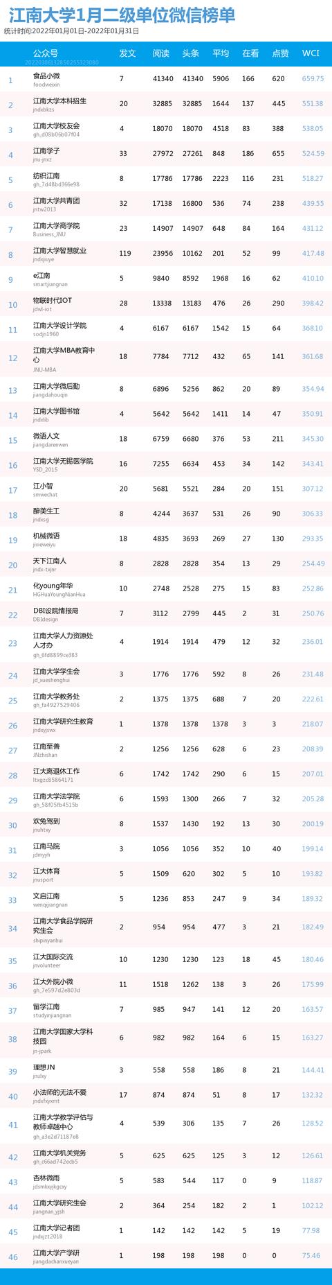 (1)江南大学校友会、江南大学本科招生、江南学生依次占据系榜第一、第二、第三的位置,总阅读量已达2w+;其中,江南大学校友会和江南大学本科招生表现突出。虽然发布的推文数量不多,但是好评不断,总阅读量很高。其他微信官方账号也表现亮眼。