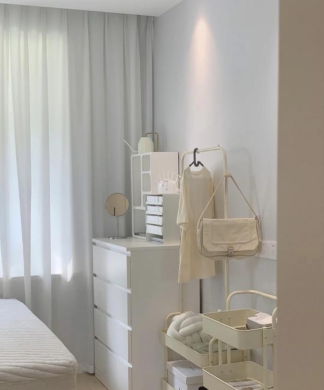 床尾放有晾衣架和衣架,每天晾晒和换衣服。奶油色很暖。