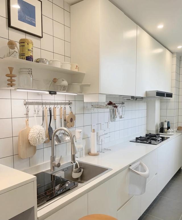 白色的橱柜配合定制的橱柜,视觉上扩大了空感,简洁耐用,无拉手,立面更为一体。