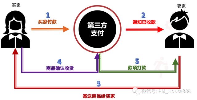 基于以上的思考,所以为了保护消费者的权益,中介担保形式的支付形式逐渐成为了商事行为,如下图所示: