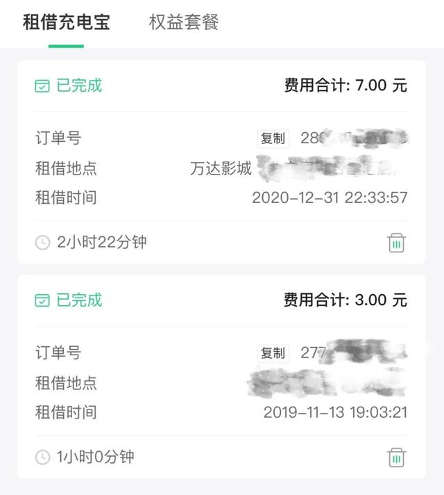 无论在微信小程序还是支付宝上,只要你搜索关键词“充电宝”,就会出来很多提供充电宝出租的品牌(街电、怪兽充电、来电),点击进去查看订单,就能查到日期、地点、租了多久。