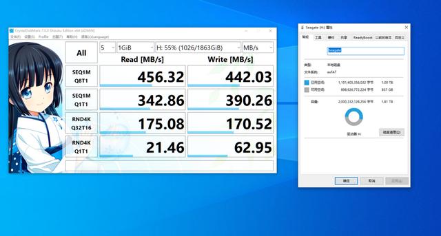 用了一段时间后,我又进行了一次50%脏盘测试,硬盘加载了1TB以上的数据文档。此时读取速度为456MB/s,写入速度为442MB/s,符合脏盘的理论性能。