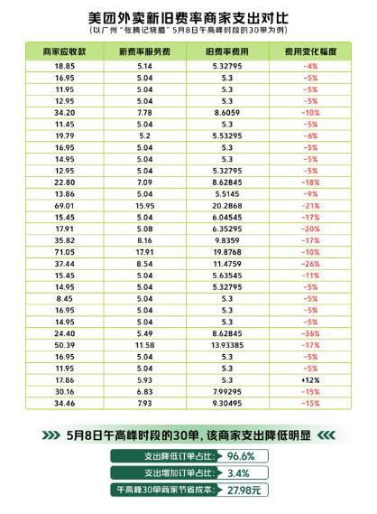 最近美团外卖开始在很多试点实行费率透明,技术服务费(提成)和配送服务费分开计算。配送服务费只有在商家选择平台配送时才会产生,时间段、距离、单价三个因素变化。记者调查发现,不少商家反映外卖率支出不同程度下降,广州商家90%的订单在中午高峰时下降,一个月节省4000多元。此外,据餐饮行业权威媒体《餐厅老板内参》调查显示,七成商家反映美团外卖成本降低,中小商家整体受益。