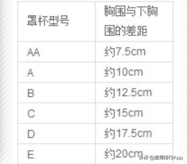 最后是激动人心的杯子。开门见山的说,胸罩尺寸的字母ABCD代表的是上胸围和下胸围的差值,也就是上胸围减去下胸围得到的数值。这个值落在下面哪个区间代表是什么杯。