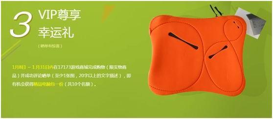 1月8日至1月31日,在17173游戏商城购物完毕(仅限实物商品),并成功评论照片单(至少一张图片配20字以上文字说明),即有机会获得优质电脑包一个(共10个名额)。