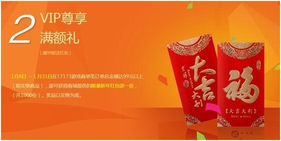 1月8日至1月31日,17173游戏玩家单笔订单总金额在99元以上(仅限实物),即可获得商城提供的限量新年红包(共1000份)。