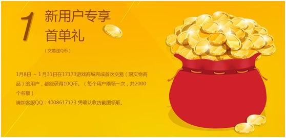 1月8日至1月31日,在17173游戏商城完成首笔交易(仅限实物)的用户,可获得10Q币,没错!你没有看错!只要首次购买实物商品,送10Q币!