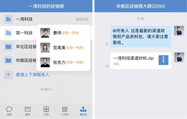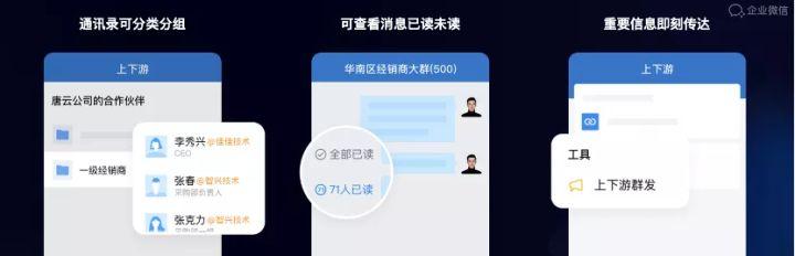 打通供应商和经销商,一键发送给所有人,不限次数,像内部员工一样在企业微信上无缝沟通,不用跨app沟通。这个功能的主要作用是让供应商和经销商像他们在一个公司的同事一样,实时了解产品进度和供应需求。
