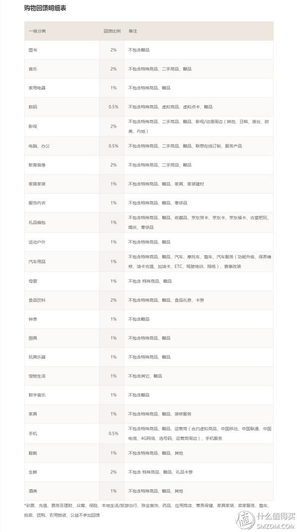 你可以看到,只有书籍、视频、饮料和生鲜可以给出2%的最高反馈。其中电脑办公和数码仅占总数的0.5%,其他多为1%。我们需要仔细阅读这份表格。