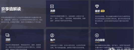 京值最终得分涉及JD.COM商城和京东金融两个平台,综合消费、信誉、活跃度、账号、小白信用计算得出,仅选取这五个方面最新的12个行为。