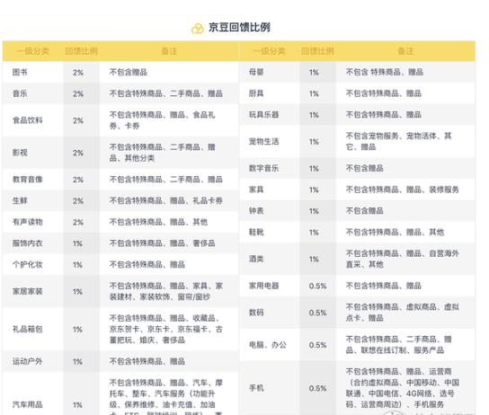▲我们来看看每个品类的JD.COM反馈比例,分为0.5%、1%、2%三个档次。除了数码产品和家用电器是0.5%,其他日常购买频率高的商品基本都是1%-2%。