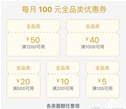 此权利每月提供100元的全品类优惠券面额。总共有105-5,200-10,500-20,1000-40,1200-50五种全品类优惠券可以兑换。可以随意领取,同一个券可以重复领取。一旦收到,优惠券在24小时内有效。