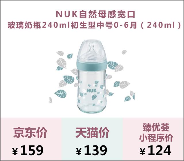 NUK是德国MAPA公司生产的优质母婴用品的著名商标,在世界母婴用品市场享有很高的声誉。NUK奶瓶都配有仿真乳头,模仿了妈妈的乳头在宝宝口中的形状(扁平),符合宝宝的口腔,有助于加强和加宽宝宝乳牙的下颌,是最接近母乳喂养的乳头。去年天猫售出79520件,深受宝妈们的喜爱。