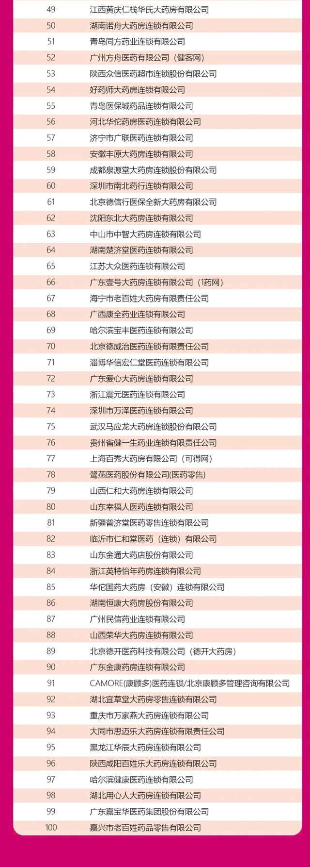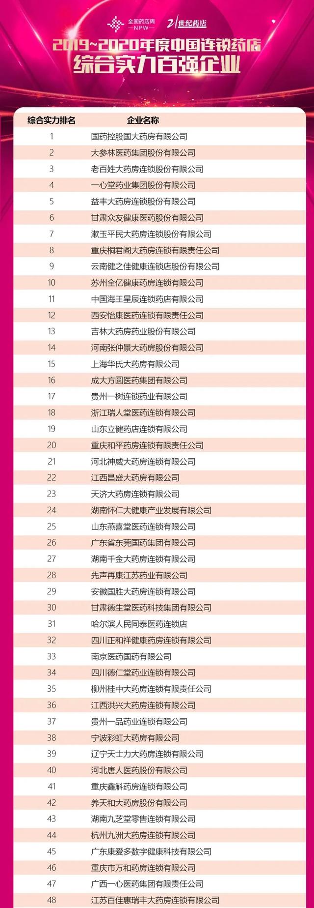 在“2019-2020年中国连锁药店综合实力百强企业”中,排名前十的企业分别是郭达大药房、大参林、人民药店、一心堂、益丰大药房、甘肃钟繇、漱玉平民、桐君阁、健之佳、全一健康。